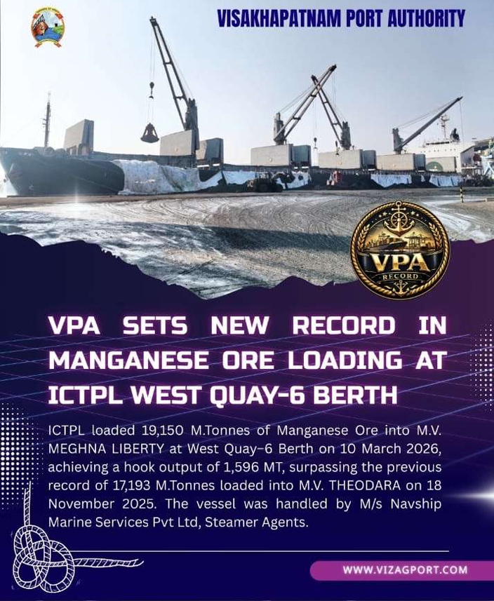 On 18th November 2025, Integrated Cargo Terminal Private Limited (ICTPL), a wholly owned subsidiary of OSL Group operating the West Quay - 6 Berth at Vishakhapatnam Port, achieved an exceptional operational landmark. A total of 17,193 Metric Tons of Manganese Ore was successfully loaded in a single day onto MV THEODORA for M/s MOIL Limited, utilizing the ship’s cranes. This performance sets a new loading benchmark at the terminal, surpassing the previous record of 12,003 MT achieved during the loading of MV HELEN BULKER at VPA Berth, West Quay – 4.
